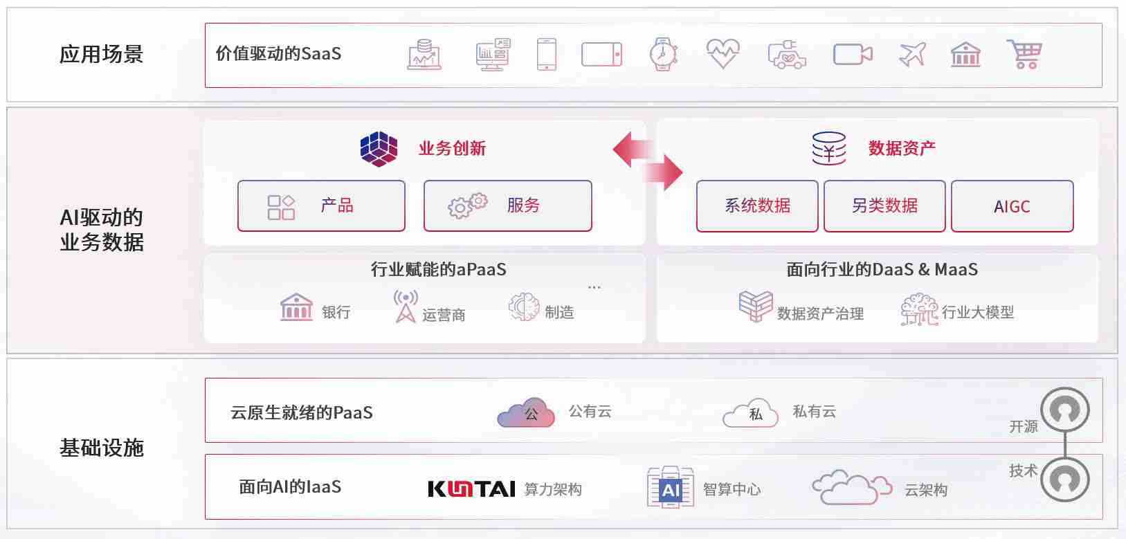 数字时代,,,围绕企业数字化转型的关键要素,,,,AG尊龙凯时数码开创性的提出数云融合战略和技术体系框架,,,,着力在云原生、、、数字原生、、、、AI原生和信创产业上架构产品和服务能力,,为处在不同数字化转型阶段的快消零售、、汽车、、金融、、、医疗、、政企、、、教育、、、运营商等行业客户提供泛在的敏捷IT能力和融合的数据驱动能力,,构建跨界融合创新的数字业务场景和新业务模式,,,助力企业级客户建立面向未来的核心能力和竞争优势,,,,全面推动社会的数字化、、智能化转型升级。。。。