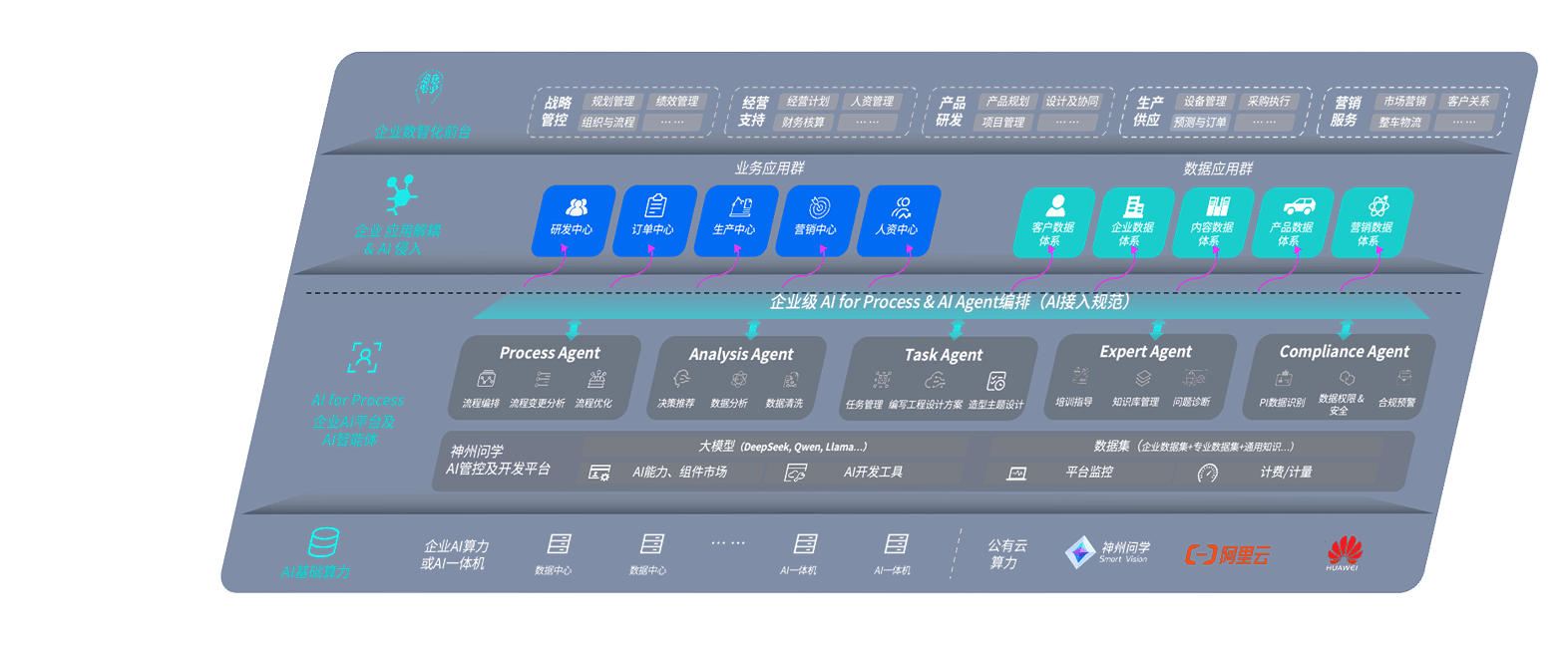 端到端的一站式AI工作空间深度融合了从企业战略规划到日常经营的全流程业务板块,,定向解决车企内部领域多、、部门多、、、、链条长、、、场景碎片化等难题,,支持车企快速构建以AI为核心的生产力写作体系,,实现任务执行与AI能力的无缝集成与交互